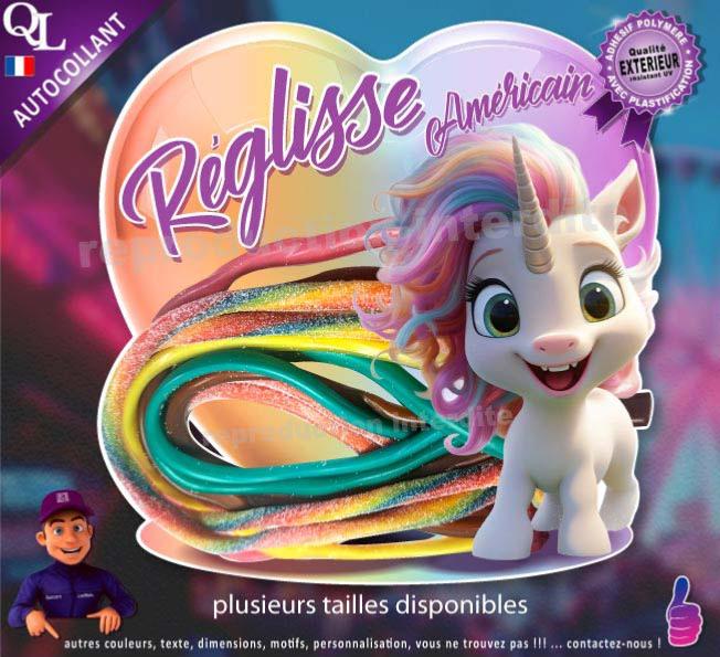 1. Sticker vinyle adhésif REGLISSE LACET AMERICAIN avec une licorne arc en ciel