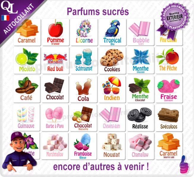 NOUVEAU les étiquettes illustrées pour indiquer le parfum de vos produits sur vos pots,couvercles, machines, présentoirs de fête foraine, confiserie, stand marchand bonbons, produits alimentaires spécifiques...